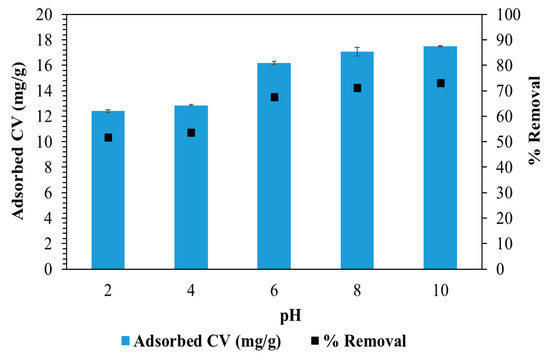Effect of solution pH (2–10) on CV adsorption to BC-PKS (initial concentration: 400 mg/L; volume: 30 mL; adsorbent dosage: 0.5 g; reaction time: 24 h; temperature: 25 °C).