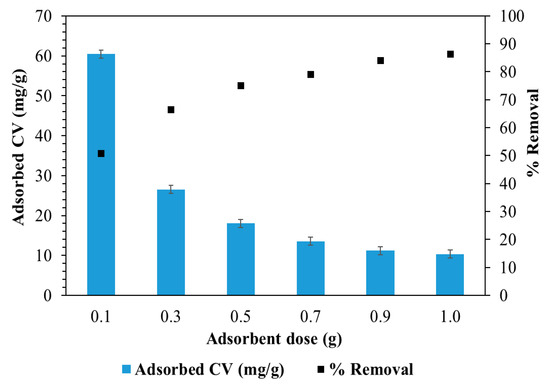 The removal of CV by BC-PKS was studied using six different BC-PKS dosages (0.1−1.0 g) with 30 mL of CV with an initial concentration of 400 mg/L; the results are plotted in Figure 4. The percentage removal of CV increases steadily as the BC-PKS dosage increases because of the increase in the number of adsorption sites [97]. As the BC-PKS dosage increases from 0.1 to 1.0 g, the percentage removal increases from 50.8% to 86.4%. Therefore, 30.9 g/L of BC-PKS dosage is required to remove 80% of the CV. Conversely, an increased BC-PKS dose reduced the amount of CV adsorption to unit mass of BC-PKS from 60.4 mg/g to 10.4 mg/g due to the split in the flux or the concentration gradient between the solute concentration in solution and the solute concentration at the BC-PKS surface [79,98].