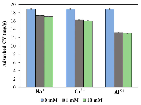 Effect of competing cations on CV adsorption on BC-PKS (initial concentration: 400 mg/L; volume: 30 mL; adsorbent dosage: 0.5 g; reaction time: 24 h; temperature: 25 °C).