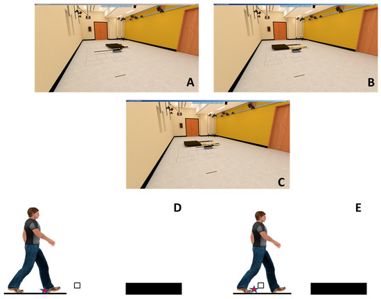 Virtual environment with the obstacle (A), platform (B) and the half obstacle and platform (C). The timing of instantaneous perturbations was triggered by a 20 N load at trailing limb heel contact (D; T1) or at 20 N of unloading at trailing limb toe-off (E; T2).