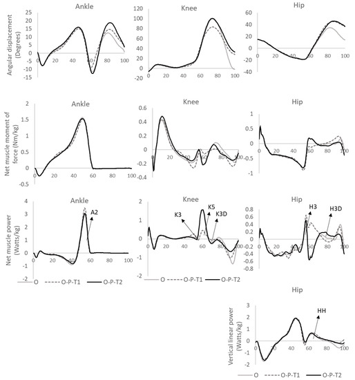 Finally, at the hip joint, hip flexion was higher when the obstacle changed to a platform, regardless of the timing of perturbations (T1 or T2). The kinetic and energetic plots showed a larger hip flexor moment combined with energy generation around toe-off (H3) when the platform appeared early (T1). For the obstacle-only condition and late perturbation (T2), there was some hip flexor energy generation at toe-off that switched to a hip extensor moment with energy absorption before returning, at mid-swing, to hip flexor power generation (H3D). There did not appear to be any change in linear hip hiking power (HH) across conditions.