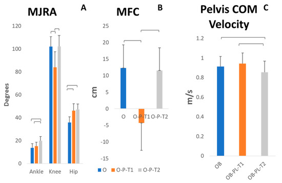 Average (standard deviation) of maximum joint relative angles (MJRA) during trailing limb swing phase (A). Minimal trailing limb foot clearance (MFC) of the obstacle—negative values correspond to the foot passing below obstacle level (B). Average pelvis center of mass (COM) velocity during trailing limb swing phase (C) across unperturbed (blue), early perturbation of obstacle to platform (O-P-T1, orange) and late perturbation (O-P-T2, gray) conditions.