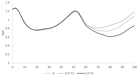 Average plots of pelvis COM velocity (COMv) across unperturbed (gray), early perturbation of obstacle to platform (O-P-T1, dashed line) and late perturbation (O-P-T2, black line) conditions. Gait stride was normalized to 100% with toe-off fixed at 60%.
