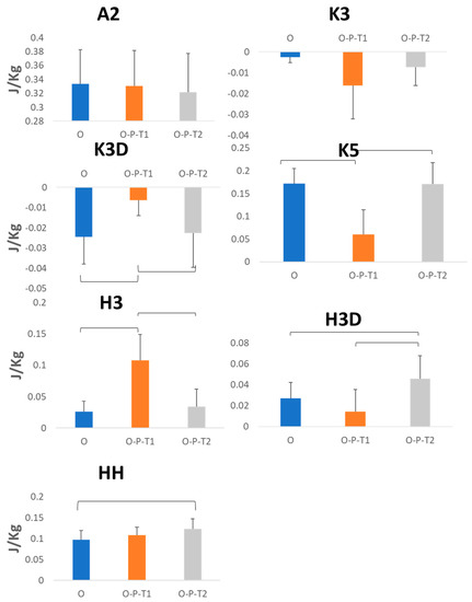 Average (standard deviation) of net muscle work corresponding to ankle push-off (A2); knee extensor absorption around (K3); after toe-off (K3D); after knee flexor generation (K5); hip flexor generation around toe-off (H3); hip flexor generation at mid-swing (H3D); and hip hiking around at toe-off (HH) across the unperturbed (O; blue), early perturbation of obstacle to platform (O-P-T1, orange) and late perturbation (O-P-T2, gray) trials.