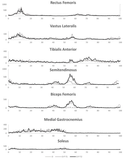 Surface EMG of seven lower limb muscles of one representative subject across conditions of unperturbed (O; gray), early perturbation of obstacle to platform (O-P-T1, dashed line) and late perturbation (O-P-T2, black line) conditions.