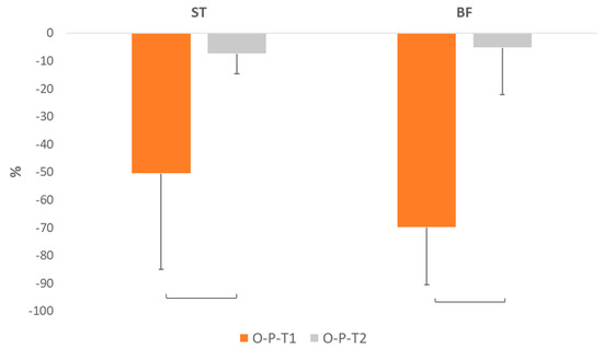 Percentage changes in the area under the curve of semitendinosus (ST) and biceps femoris (BF) EMG activity corresponding to the K5 power burst across the early perturbation of obstacle to platform (O-P-T1, orange) and late perturbation (O-P-T2, gray) conditions.
