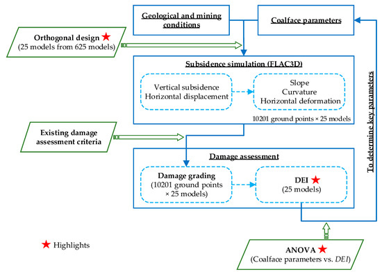 This research aims to identify the key parameters of super-large coalfaces as related to the damage extent of the ground surface. Then these key parameters can be used to optimize the coalface design before underground exploitation to reduce the ground damage. The research process can be mainly divided into three steps: