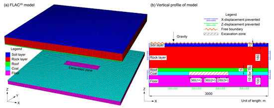The model after excavation for Test 5 is shown in Figure 2 as an example. To better illustrate the ore body layer, for the 3D model in Figure 2a, the overlying strata are uniformly raised by 1000 m (just for display). The plane size of this model is 3000 × 3000 m, which is fixed for all 25 models. The coal thickness is 10 m for this test (from Table 2), while the thicknesses of the other layers are shown in Table 3. This model (before excavation) has a total of 183,618 nodes and 170,000 blocks.