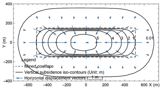 The vertical subsidence and horizontal displacement at all model nodes are extracted after the excavations. The ground values (top surface of the model) are managed with the software Mathematica in table form. As shown in Figure 3, the vertical subsidence is plotted as iso-contours and the horizontal displacement is plotted as vectors. The horizontal displacement could also be plotted as iso-contours in the strike and dip directions of the coalface, which would require two separate figures.