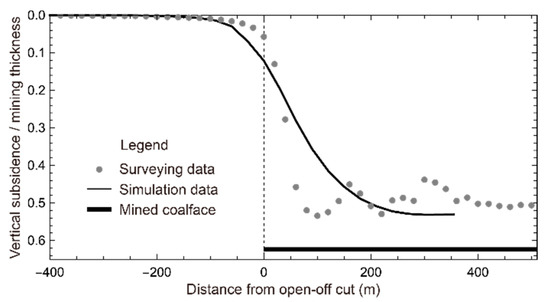 The vertical subsidence of the ground surface was measured 11 times during the excavation of the prototype coalface; the 11th dataset (obtained after the subsidence was stopped) was used to verify the corrections in the numerical simulation results. A simulation test with the coalface parameters close to the prototype is employed for the comparisons. Test 3 was appropriate as its length in the dip direction, thickness and mining speed were 300 m, 6 m and 14 m/day. However, the length in the strike direction of the coalface of Test 3 was 600 m, which was much shorter than that of the prototype (3529 m). Such a length ensured that the excavation reached critical and the comparison of the surveying and simulation data was only at the half-side close to the open-off cut. Therefore, differences in the strike lengths are acceptable. For a better comparison, the vertical subsidences of the surveying and simulation data were divided by their mining thicknesses (4.81 and 6 m) and then plotted (Figure 5).