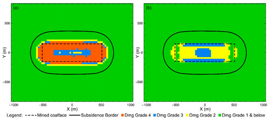 Two kinds of objects are selected for this study: buildings and timberland. Both objects are typical in our study area and have ready-made and distinct assessment criteria. It is noted that this paper is not concerned with rulemaking, but instead uses existing industry standards. Table 5 and Table 6 show the damage assessment criteria of buildings and timberland as derived from “The Regulations of Coal Mining and Pillar Design for Protecting Buildings, Water Bodies, Railways, Main Mineshafts and Tunnels” [33] and “Regulation on Compiling Land Reclamation Plan—Part 3: Underground Coalmine” [50], respectively. From these two assessment criteria, it is found that the building damage is primarily sensitive to the subsidence factors of deformations and the timberland damage is related to both subsidence displacements and deformations.
