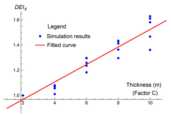 As illustrated in Table 9, the factor C (thickness) significantly influences the index DEI, i.e., it is the key parameter of the coalface considering timberland on the ground. The relationship by fitting this factor (4th column in Table 2) and the simulated DEI (4th column in Table 7) using the least square method in Mathematica can be described by the following equation: