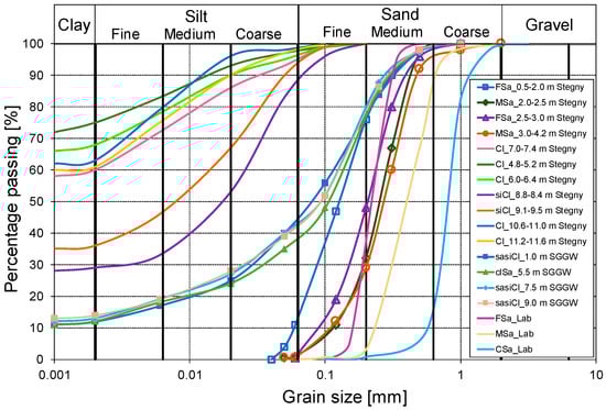 Figure 2 presents the grain-size distribution curves for several soil samples: fine and medium sands (FSa, MSa), and clays (Cl and siCl) taken from the subsoil of the Stegny site, and sandy clays (sisaCl) and clayey sands (clSa) taken from the SGGW Campus. The graph contains also the grain-size distribution curves that have been tested in the laboratory, including sandy clays (sisaCl) from the SGGW Campus tested in a modified oedometer and samples of fine, medium and coarse sands (FSa, MSa and CSa) tested in the column apparatus.
