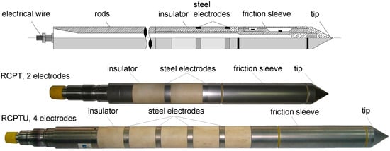 Extensive development of survey methods in the recent years, both in geophysics and geotechnics, has allowed for the modification of the existing measuring instruments. New instruments have been developed, including the RCPTU (resistivity cone penetration test with pore pressure “u” measurements) probe [30,31,32], for measuring electrical resistivity and other common parameters. These tests are mostly used in geotechnics to assess the condition of, e.g., a structure’s foundation [33,34], hydrogeological conditions [35,36] or physico-mechanical properties of the soil [37].