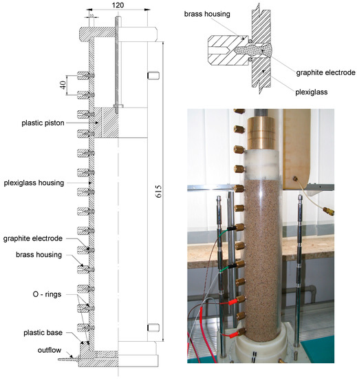 Two test stands adapted for testing non-cohesive and cohesive soils depending on the needs and the required scope of tests were installed in the laboratory. The column for testing non-cohesive soils was equipped with chemically insensitive graphite electrodes for measuring the electrical resistivity of sands and gravels (Figure 5).