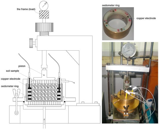 The second test stand was a modified oedometer, in which electrodes were installed to register changes in the electrical resistivity of a sandy clay sample (sisaCl) taken from the SGGW Campus under load changes (Figure 6). The piston and oedometer ring, in which the soil sample was located, were made of an insulating material. Four flat copper ring electrodes were installed in the oedometer ring walls in a way that ensured the contact of the electrodes only with the soil sample and not with the brass casing. The width of the electrodes was 2.5 mm, while the inner diameter of the ring was 50 mm. The electrodes were arranged at equal, four-millimeter distances, in accordance with the four-electrode Wenner array (two outer electrodes were current electrodes generating the electric field in the soil sample, while the two inner electrodes in the ring were used to measure the electric field potential). Before testing, the oedometer was calibrated using (potassium chloride) solutions with known electrical resistivity.