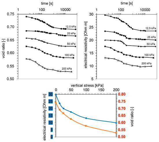 Figure 8 shows the consolidation curves in relation to curves of electrical resistivity changes as functions of time. The electrical resistivity of the sandy clay sample (sisaCl from SGGW Campus) recorded during the test is inversely proportional to the increasing vertical stress. This study resulted in setting an empirical relation between porosity and electrical resistivity, which is shown in Figure 9 and describes this relation when the saturation degree is close to 1, and is described by the equation: