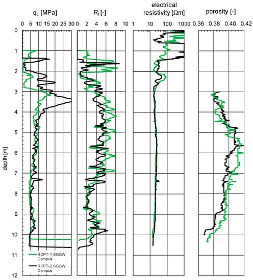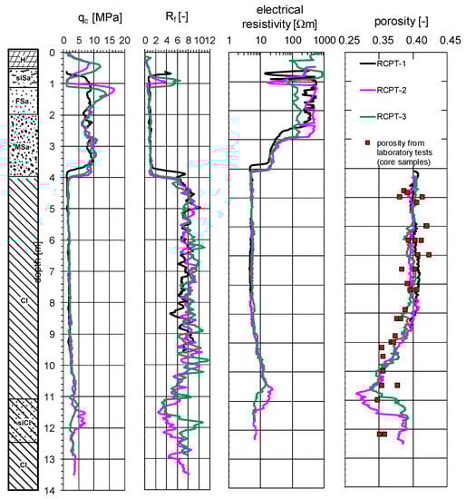 Assessment of porosity in cohesive soils is complicated and requires knowledge of the electrical resistivity of groundwater, which can vary with depth [30]. Electrical resistivity measurements assisted to geotechnical exploration in this case, and this simple relationship seems to be sufficient assuming that CEC and B+ are not included. Figure 10 shows the RCPT test results: changes in cone resistance qc, friction ratio Rf, electrical resistivity profile and porosity calculated according to Equation (7). In addition, the figure presents the porosity values obtained from laboratory tests on undisturbed soil samples.