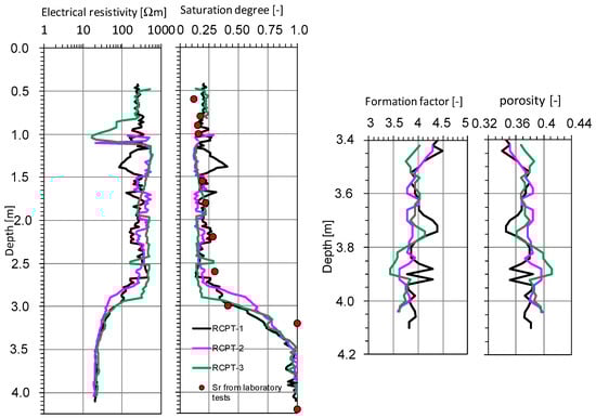 Studying the relationship between porosity, saturation degree and electrical resistivity is interesting in both geophysics and geotechnics, e.g., [33,37]. The presented relationships showed a positive relation in these studies. However, electrical resistivity measurements still remain empirical and site restricted. The application of the above relationships in practice, and especially those used for cohesive soils, is only possible for a specific locality and soil type. Equations (4) and (5) established for sands seem to be universal and similar relationships were determined in other areas. The use of RCPT probes for this purpose is easier due to the measurement accuracy than the use of surface geophysical surveys.
