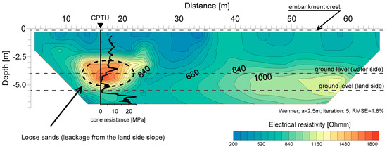 Figure 13 shows the example results of electrical resistivity imaging. Along the entire length of the analyzed embankment section, the electrical resistivity of its fill was between 600 and 800 Ωm. The analysis included the embankment sections, in which electrical resistivity was significantly different from the background values (~600 Ωm). An area of significantly higher electrical resistivity up to 2000 Ωm was observed on the left side of the cross-section. High electrical resistivity may indicate loosened soil in this area and significant leakage through the embankment body. Control tests using a CPTU probe to validate the electrical resistivity results in this area indicate the presence of loosened soil.