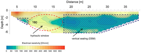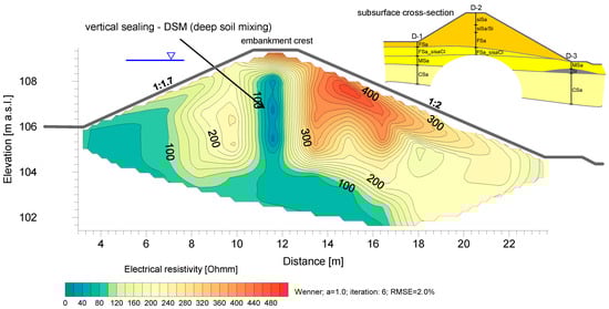 Geophysical surveys were conducted again; this time they were aimed at indicating the sealing continuity. The electrical resistivity method was used to distinguish the less permeable vertical layer in the embankment body. The purpose of the tests was also to investigate the depth of the DSM columns and confirm the sealing continuity. For a more accurate diagnosis, direct soundings could then be used [48]. The interpretation and testing results are presented in Figure 14 and Figure 15.