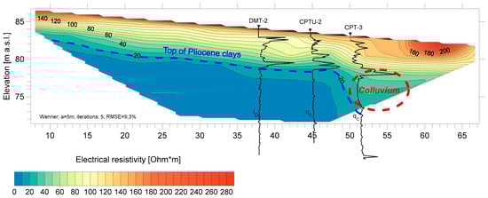 The first one—the Vistula slope area—shows the use of electrical resistivity measurements to determine the top of undisturbed clay deposits. For this purpose, several electrical resistivity profiles were carried out. Figure 16 shows a geoelectrical cross-section in combination with cone resistance qc and dilatometric index ID values obtained during CPTU and DMT (flat dilatometer test) tests. CPTU and DMT tests showed a diversified structure of the colluvial-delluvial deposits in the slope area. The change in cone resistance and dilatometric index indicates the top of clay deposits at 6 ÷ 6.5 m below ground level (DMT-2, CPTU-2) in the western and middle part of the cross-section. The cone resistance values obtained during CPT-3 testing (eastern part of the cross-section) showed diverse parameters and thus significant diversity of strength and strain parameters due to numerous lenses in colluvial-delluvial deposits in the slope area. Two zones: one at 7.5 to 11 m—cone resistance 1 ÷ 2 MPa (clay in the colluvial area) and one below 11 m—cone resistance of approximately 3 MPa, were observed during the analysis of cone resistance during CPT-3 testing. The difference in measured cone resistance indicates 11 m as the depth of the undisturbed top of clay deposits and the bottom of colluvial-delluvial deposits.