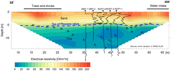 The cross-section also shows the cone resistance values (qc) obtained during RCPT tests and the material index values (change in ID value below 0.6 indicating transition into silty soil) obtained from DMT tests. Both the cone resistance and the material index show the transition in the soil type in the tested area at the depth of 4.0 ÷ 4.2 m below ground level. Detailed analysis of RCPT tests (Figure 10) shows a boundary between sands and clays in this area at the depth of approximately 4 m below ground level. The electrical resistivity for sands is between 100 Ωm to several hundred Ωm, and for clays between 4 Ωm and 12 Ωm.