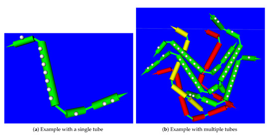 In the simulated environment, the tubes are also modeled as a set of cylinders with the same lengths, radii, and poses as those computed during the tube modeling phase. The only differences are that cylinders are created for each joint to connect each pair of endpoints and a sphere with a radius equal to the tube’s radius is added to each endpoint involved in a joint. These two changes prevent the tubes from having gaps. To reduce the number of objects in the simulated environment, and thus decrease the computational effort, none of the models for the robot’s parts are added to the simulated environment. Figure 4 presents some examples of simulated tubes in Gazebo.