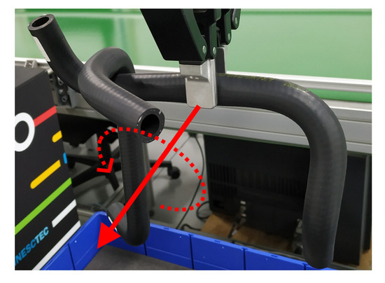 Failure detection is crucial in bin picking operations. If an item falls outside a robot’s working area, it may compromise the following steps in an assembly line. For this reason, companies spend much money on regular quality checks for their products and manufacturing pipelines. Force/torque sensors have been used several times to detect if pick-and-place operations were successful [14,15,16]. Moreira et al. focused on picking a set of entangled flexible tubes from a vehicle’s air conditioning system [15]. They assumed that grasp and motion planning routines already existed and that the mass of the tubes was known. By using the data from a six-axis force/torque sensor coupled with machine learning algorithms, they determined if the tube slipped after being grasped. Kanoulas et al. proposed a key strategy in their algorithm which is also used in this paper: if the force readings lie outside the expected range, the robot releases the object being grasped [17]. Costanzo et al. presented the concept of manipulating a grasped object using force feedback [18]. In their study, they used force/tactile sensors to adjust a parallel-jaw gripper’s force so that it could rotate around its axis whilst maintaining the object’s orientation. In this paper, rather than adjusting the closing force, torque feedback is used to determine the gripper’s axis of rotation so that non-grasped tubes that were inadvertently lifted are dropped back in the bin.
