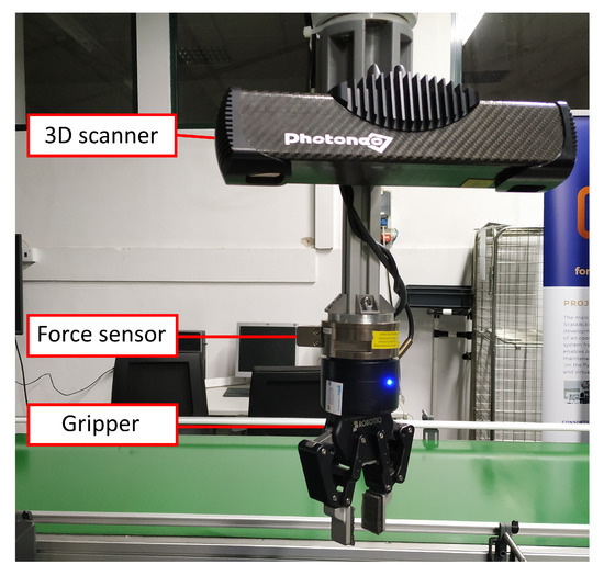 Figure 8 provides an overview of the arrangement used to conduct the experiments. A Yaskawa Motoman HC10 robot arm was used. It has a reach of 1200 mm and can handle payloads of up to 10 kg with a repeatability of 0.1 mm. A Robotiq 2F-85 gripper was attached to its flange, alongside a Photoneo PhoXi 3D Scanner S and an ATI Gamma SI-65-5 force/torque sensor, as shown in Figure 9. The 3D scanner has a range from 384 to 520 mm and a resolution of 3.2 million points. At the optimal distance (442 mm), it has a scanning area of 360 mm × 286 mm and an accuracy of 0.05 mm. The force/torque sensor is able to sense forces of up to 200 N in the z direction, with a resolution of 1/40 N. It can also detect torques of up to 5 N·m in each direction, with a resolution of 10/13,333 N·m.