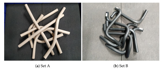 The tubes on Set A are the same as those used on the conference article focused on the tube modeling phase [3]. They are straight plumbing pipes that were manually bent to have different shapes. They correspond to a simpler test case since their material has less friction, and thus the tubes that are on top of the one being picked tend to slide back into the bin.