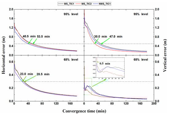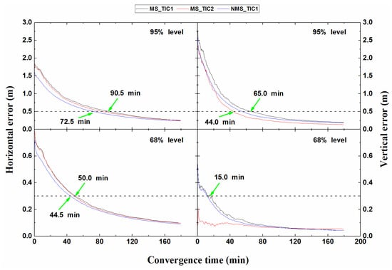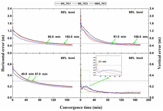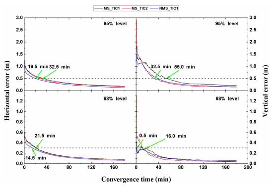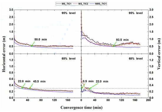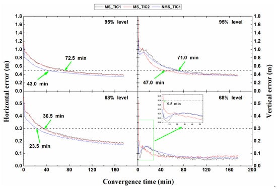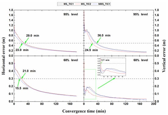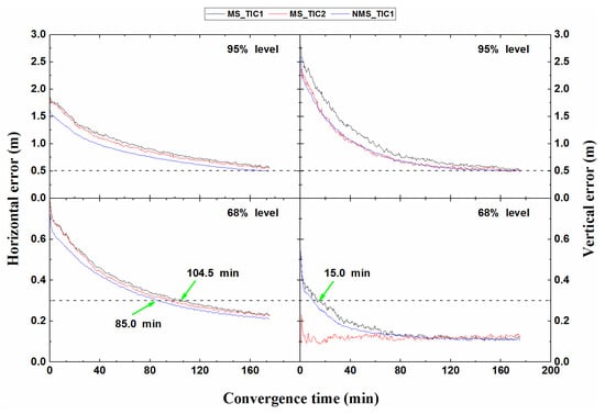Table 2 shows that for the TIC2 at the 95% level, the convergence time in the kinematic mode was shortened by 10.6% in the horizontal component and 34.2% in the vertical component in the MS period when compared to the TIC1. In the static mode, the convergence time was improved from 53.5 to 47.5 min (11.2%) in the horizontal component and by 36.2% from 47.0 to 30.0 min in the vertical component. At the 68% level, the convergence time was shortened by 12.3% and 3.5% in the horizontal component of the TIC2 in the kinematic and static modes, respectively, which were comparable to the TIC1 in the MS period. However, the convergence time of TIC2 in the vertical component was 0.5 min longer than TIC1. The convergence time of TIC1 in the NMS period will be further analyzed. When compared to the MS period, the convergence time in the horizontal and vertical components was shortened by 34.9% and 41.8%, respectively, in the kinematic mode and at the 95% level in the NMS period. While in the static mode and at the 95% level, the convergence time was 24.3% and 12.8%, respectively. When compared to the MS period, in the horizontal component and at the 68% level, the TIC1 at the NMS period shortened the convergence time by 29.8% and 19.3% in the kinematic mode and static mode, respectively. However, their convergence time was equal to 0 in the vertical component.