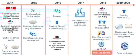 Establishment of a non-profit Innovative Medicines for Tuberculosis Foundation (iM4TB Foundation) at Ecole Polytechnique Fédérale de Lausanne (EPFL) in March 2014 was a principal milestone for the further development of PBTZ169 and its transformation from a valuable TB drug candidate to the compound reaching promising results in the pilot clinical studies (Figure 3) []. This approach was necessary to overcome the lack of interest from pharmaceutical companies to address the disease primarily affecting low-income countries. The mission of the foundation is “to develop better and faster-acting medicines to fight tuberculosis and bridge the gap between scientific discovery and the market in order to provide affordable TB treatment to anyone in the world”. In July 2014 the foundation joined in this effort with the Russian pharmaceutical company Nearmedic Plus LLC, which bought a license covering the use of PBTZ169 in most countries of the former Soviet Union, while iM4TB retained the rights for the rest of the world. Investments of Nearmedic, along with funds raised by iM4TB, including the generous support of the Bill and Melinda Gates foundation, enabled performing all necessary pre-clinical trials with PBTZ169, such as ADME (absorption, distribution, metabolism, excretion) profiling, toxicology studies, as well as production of clinical supplies of the drug, and preparation of regulatory documents necessary for entering the first clinical trials [,].