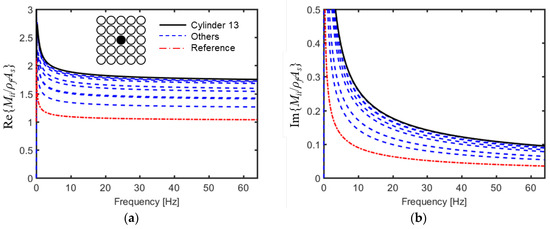 Comparison between exact solutions and calculated added masses of a single cylinder using Lin’s method: (a) real part and (b) imaginary part.