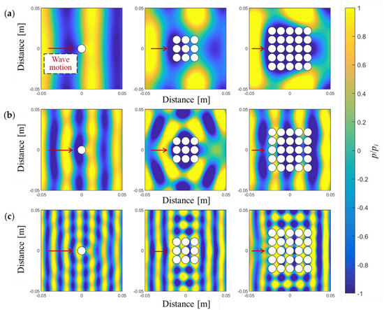 Pressure wave pattern produced by the multiple scattering of the plane wave with a wavelength of (a) kfR = 0.5, (b) kfR = 1.0, and (c) kfR = 2.0. The left, middle, and right sides of the contours represent wave propagation with one, nine, and 25 cylinders.