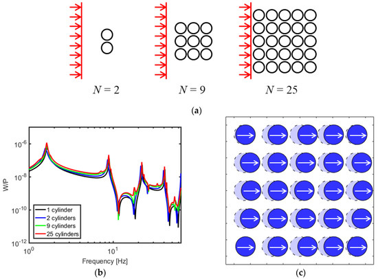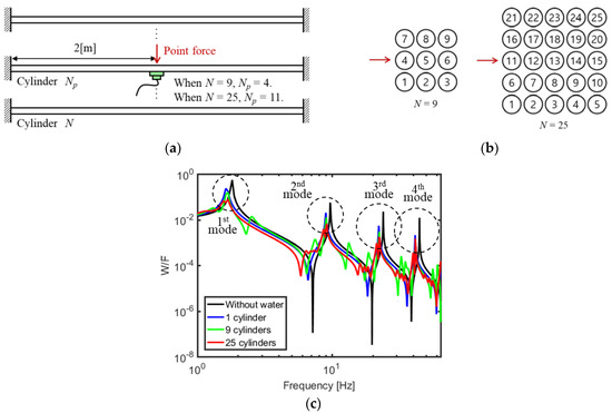 (a) Nuclear fuel rod bundles varying the number of cylinders in the fluid subjected to point force, (b) cross section, and (c) calculated transfer functions.
