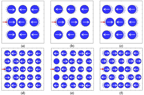 Mode shapes of nuclear fuel rod bundles in the fluid medium: (a) N = 9, f = 1.3 Hz; (b) 1.6 Hz; (c) 2.5 Hz; (d) N = 25, f = 1.1 Hz; (e) 1.6 Hz; and, (f) 9.1 Hz.