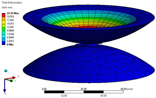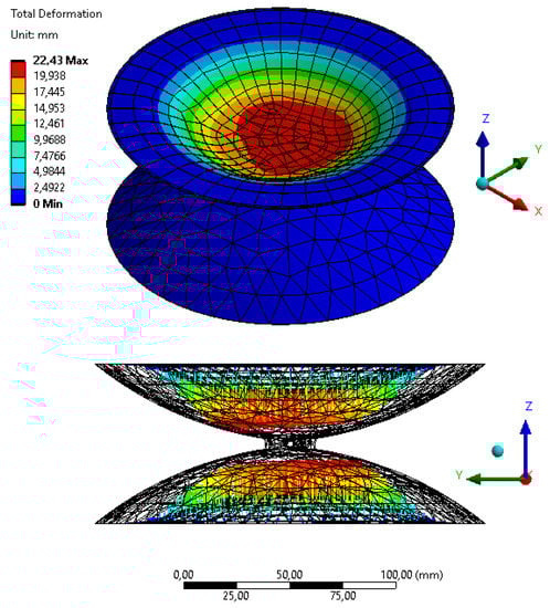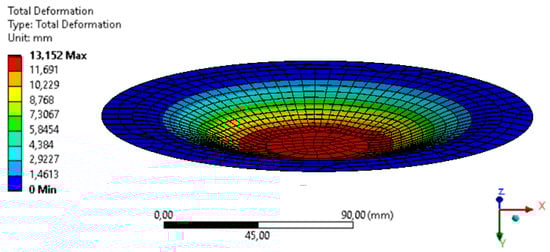 The obtained data were used to identify the value of Young’s modulus in the developed FEM model. Figure 3 shows the membrane’s FEM model loaded with force 1.42 [N]. Table 3 and Figure 4 provide a faithful comparison of simulations with measurements in the full load range of the actuator.