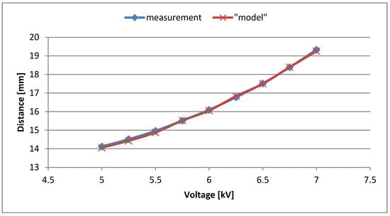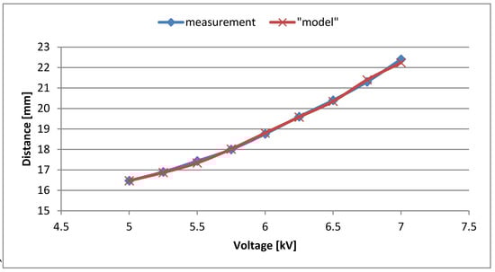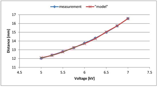 The operation of the device in an actuator mode using the DEAP membrane requires a power supply. To collect reference data, a number of experiments on the deformation of the actuator membrane were carried out under the influence of various supply voltages. The relatively narrow range of membrane supply was sampled at nine points from 5.0 [kV] to 7.0 [kV] with a 0.25 [kV] step. This approach allowed the determination of the virtual value of Young’s modulus compensating for the nonlinear structure of the DEAP model.