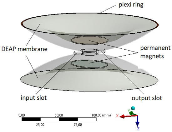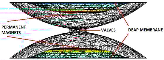 Based on the obtained values of the virtual Young’s module, a pump model was developed. In order to increase the force and thus the scope of the pump operation, two permanent magnets were implemented (see Figure 8). The model used neodymium magnets with a diameter of 17 [mm] and a height of 2 [mm]. The mass of each magnets was 3.4 [g] and the lifting capacity was about 2 [kg] for the induction of remanence 1.22–1.25 [T]. The force between two identical cylindrical magnets was approximately calculated according to Gilbert’s model [17,18]. This force in the start position without the pump supply was 0.8 [N], which caused a static deformation of membranes equal to 8 [mm].
