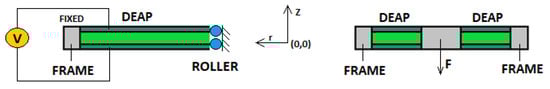 A DEAP membrane is made of a silicone membrane that is pre-stretched during the production process. Then, the carbon grease electrodes are printed. In principle, DEAPs are similar to flexible capacitors. As can be seen in the Figure 1, they consist of an elastomeric film sandwiched between two electrodes. Applying voltage to them leads to compression of the elastomer, which causes a change in capacity [9,10,11,12,13].