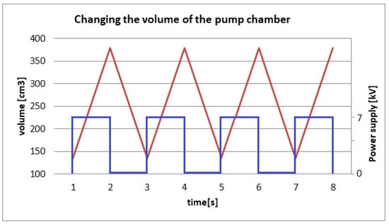 In the suction cycle, the inlet slot (valve) opens and the outlet slot (valve) closes. In order to pump out the medium, the valves change their state and a voltage of 7 [kV] is applied to the membranes. The change in volume of one pump chamber ranges from 135.64 cm3 to 379.81 cm3 and its graph over time is shown in Figure 12. In the suction cycle, the inlet valve opens, and the outlet valve closes. In order to pump out the liquid, the valves change their state and the voltage on the membrane electrodes is switched on.