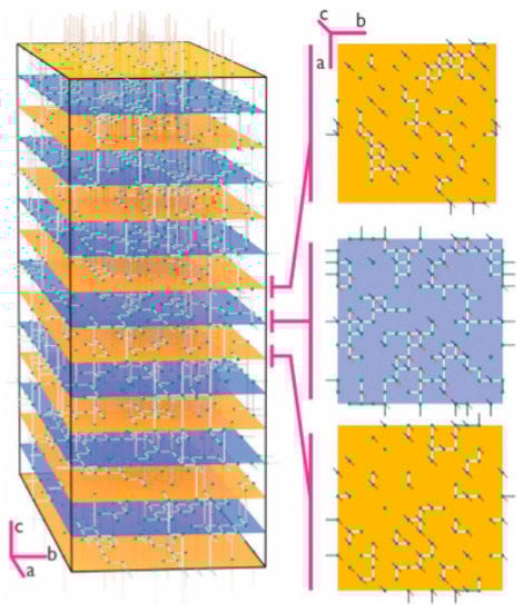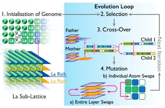 where Rdis. (R(La-rich)) is the occupancies of the A-sites by the exact amount of La3+ ions for the disordered (La-rich) layered structure. Therefore, for S = 0 the system’s structure is completely disordered. Figure 4 represents LLTO with Lapoor and Larich layers coloured in blue and yellow respectively. For S = 0 the MD calculations by Jay et al. [59] revealed that lithium diffusion is completely homogeneous and isotropic. From an atomistic point of view this can be explained as lithium diffusion in LLTO is facilitated by vacancies, therefore the stoichiometry and the ordering degree that constitute the percolating network (refer to Figure 4) are key [59]. Given the number of possible combination of Lapoor and Larich layers it becomes computationally intractable to consider all the different possibilities for large number of atoms. To overcome this hurdle Jay et al. [59] investigated the impact of the structure on the conductivity of LLTO using MD combined with a genetic algorithm (GA) (refer to Figure 5). This approach was the first to reproduce the experimental results in this material [157], and more importantly it is an effective defect engineering strategy to maximise the lithium diffusivity by tailoring the lanthanum content of the layers. This approach is a paradigm and in essence transferable thus it can lead to the design of advanced materials with optimised properties particularly in disordered systems with a wide range of possible compositions and stoichiometry [158,159,160,161,162,163]. The trend is on machine learning techniques to encounter difficult problems in science and engineering [164].
