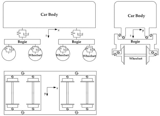 This study takes the CRH3 vehicle (a vehicle which widely operates in the HSR system in China) as the modeling target, which is made up of one car body, two bogies, four wheelsets, suspension systems, etc. The vehicle model was developed according to multibody dynamic theory, and a rigid body with six degrees of freedom (DOF), which are in the vertical, lateral, longitudinal, pitching, yawing, and rolling directions, was employed to simulate the car body, bogies, and wheelsets. As a result, the elastic deformations of the components were ignored, and the total number of DOF was 42. Further, the suspension systems, which consist of the primary and secondary suspensions, were regarded as nonlinear springs connecting the car body, bogies, and wheelsets. This rigid vehicle model can be adopted to investigate the vibration of the vehicle–track–bridge system. However, due to neglect of the elastic deformation of the wheels, the rigid vehicle mode is deficient for investigating rail corrugation, wheel polygons, etc. A topological graph of the vehicle model is shown in Figure 1.