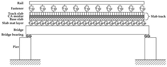The track–bridge model consists of the CRTS-II slab track and the simply supported beam bridge, as shown in Figure 2. The track structure includes the rails, fasteners, track slab, CA mortar, base slab, and slab mat layer. The bridge structure contains the bridge bodies and bridge piers, which are connected by bridge bearings. In order to depict the physical and geometric characteristics, except that the fasteners, the slab mat layer, and the bridge bearings were regarded as spring damper elements; the rest of the components in the track–bridge model were all simulated by solid elements, which can take deflection and shear deformation into account.