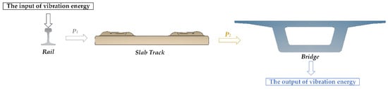 The power flow of the track–bridge system reflects the transfer of vibration energy in the components of the track–bridge system, and the vertical transfer of vibration energy is illustrated in Figure 4. In order to balance the accuracy and calculation cost and eliminate the influence of the boundary effect, a proper length of research area needs to be chosen. In this work, a length of track slab in the middle of the vehicle–track–bridge system was selected. Furthermore, the power flows of the rail and connecting elastic elements of the fasteners were regarded as the input vibration energy of the track–bridge system with the symbol Pin. The power flows of the slab track and connecting elastic elements of the slab mat layer were regarded as the input vibration energy of the slab track with the symbol P1. The power flows of the bridge body and the connecting elastic elements of the slab mat layer were then summed up as the input vibration energy of the bridge with the symbol P2. Finally, the power flow transfer from the bridge to the ground was denoted Pout.