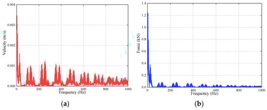 The running speed of the vehicle was set to 300km/h, and the power flows of the track–bridge system and corresponding evaluation indices were obtained under this condition. The frequency-domain velocity and force results of the rail and fasteners are shown in Figure 5 as an example.