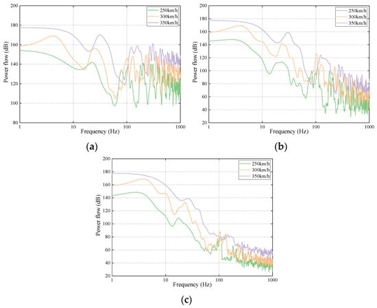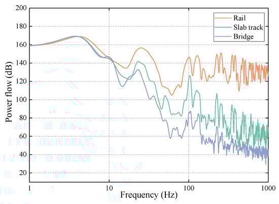 Figure 6 reveals that there were many peaks of power flows in the frequency range investigated. In addition, the power flows decreased obviously from top to bottom of the track–bridge system. This is because the vibration gradually attenuates from top to bottom of the track–bridge system in the transfer process. The differences in power flows between the rail and the slab track reflect the attenuation effect of the fasteners. In addition, the differences in power flows between the slab track and the bridge reflect the attenuation effect of the slab mat layer as well. Furthermore, the attenuation effect of fasteners is more significant in the frequency range of 150 Hz to 1000 Hz, that is, at a high frequency range, whereas the attenuation effect of the slab mat layer is more obvious in the frequency range of 45 Hz to 200 Hz, that is, at a low frequency range. Therefore, it can be inferred that the fasteners have an obvious damping effect at a high frequency range; on the contrary, the slab mat layer presents an evident damping effect at a low frequency range.