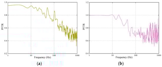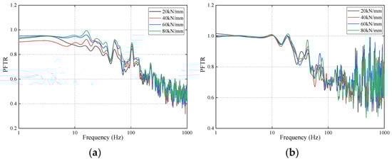 The PFTRs of the track–bridge system with different fastener stiffness levels are depicted in Figure 13. It can be seen from Figure 13a that the PFTRs were all below 1.0 when the vibration energy transferred from the rail to the slab track. Besides this, the PFTRs increased as the fasteners’ stiffness rose at frequencies of 9 Hz to 139 Hz, except for some frequencies. In addition, the PFTRs for 40kN/mm reached minima for frequencies below 9 Hz. The PFTRs for 80 kN/mm were basically at maximum in the frequency range investigated.