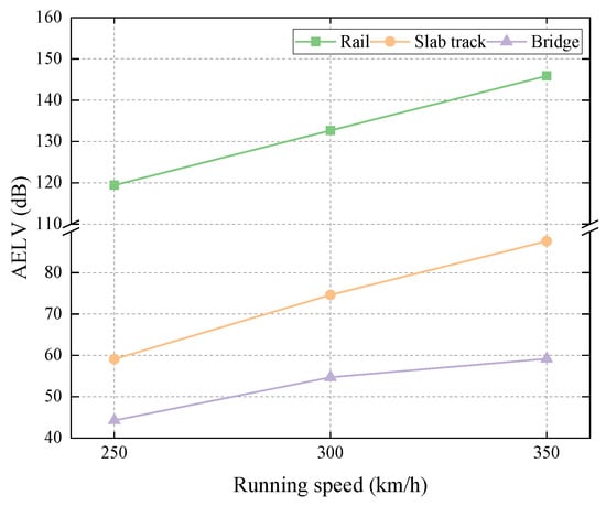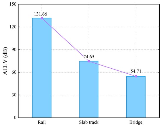 The AELVs of the track–bridge system are depicted in Figure 8. It can be observed that the AELVs of the rail, the slab, and the bridge present an order of large, medium, and small, respectively. This phenomenon arises from the elasticity and damping effects of fasteners and the slab mat layer. Moreover, the fasteners had a better vibration damping effect on the AELVs than the slab mat layer.